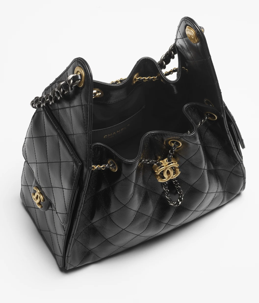 • Iconic CC-style front turn-lock and drawstring chain closure