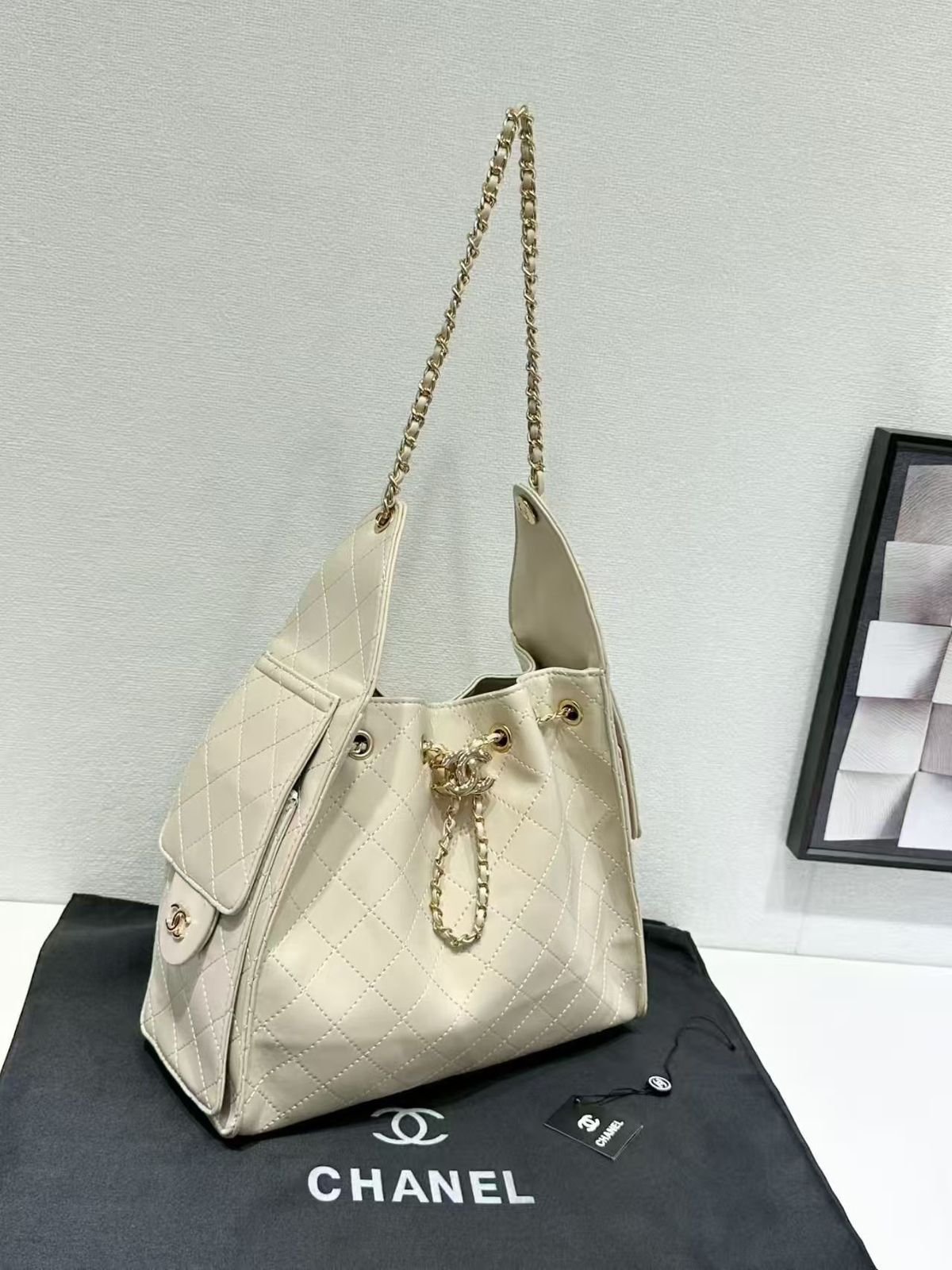 Chanel Quilted Leather Drawstring Chain Shoulder Bag – Classic Beige with Gold Hardware