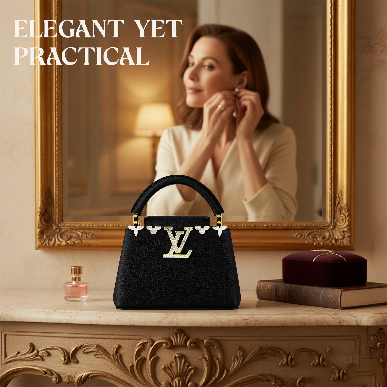 Our Luxury first-copy top-handle bag is crafted from high-quality textured leather, adorned with rich gold-tone hardware, and finished with exceptional stitching for a flawless look. This bag offers both style and versatility — carry it by the top handle for a classic, polished look or use the detachable strap for a comfortable crossbody option
