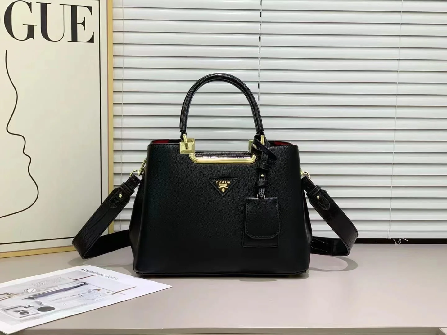 Elevate your everyday style with the First Copy Prada Galleria Saffiano Leather Handbag, a timeless icon of sophistication and luxury. Crafted from premium black Saffiano leather, this bag exudes elegance and durability. The structured silhouette is complemented by polished gold-tone hardware, including the signature Prada triangle logo plaque on the front.