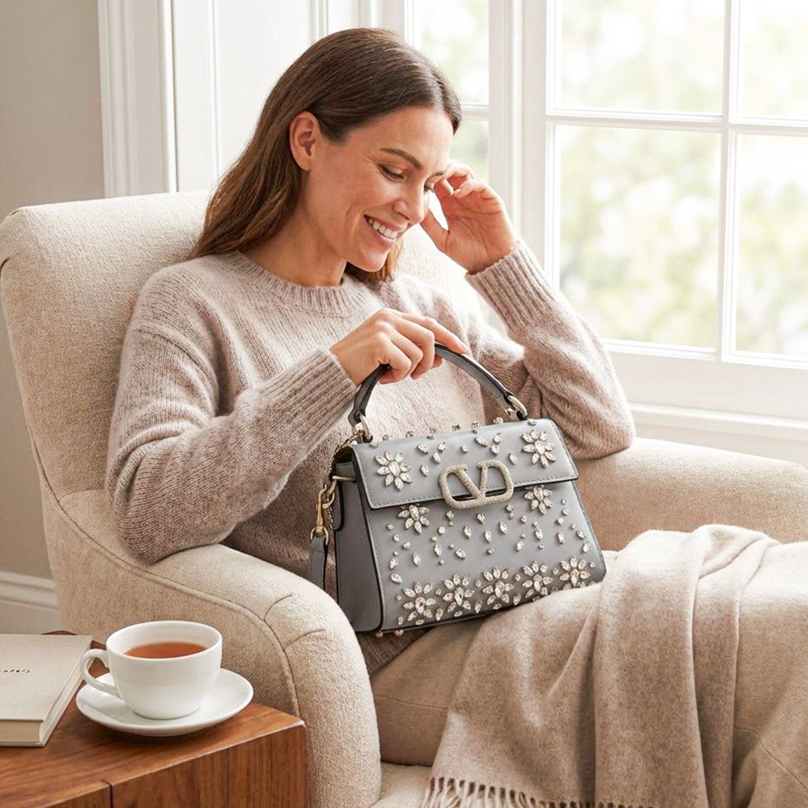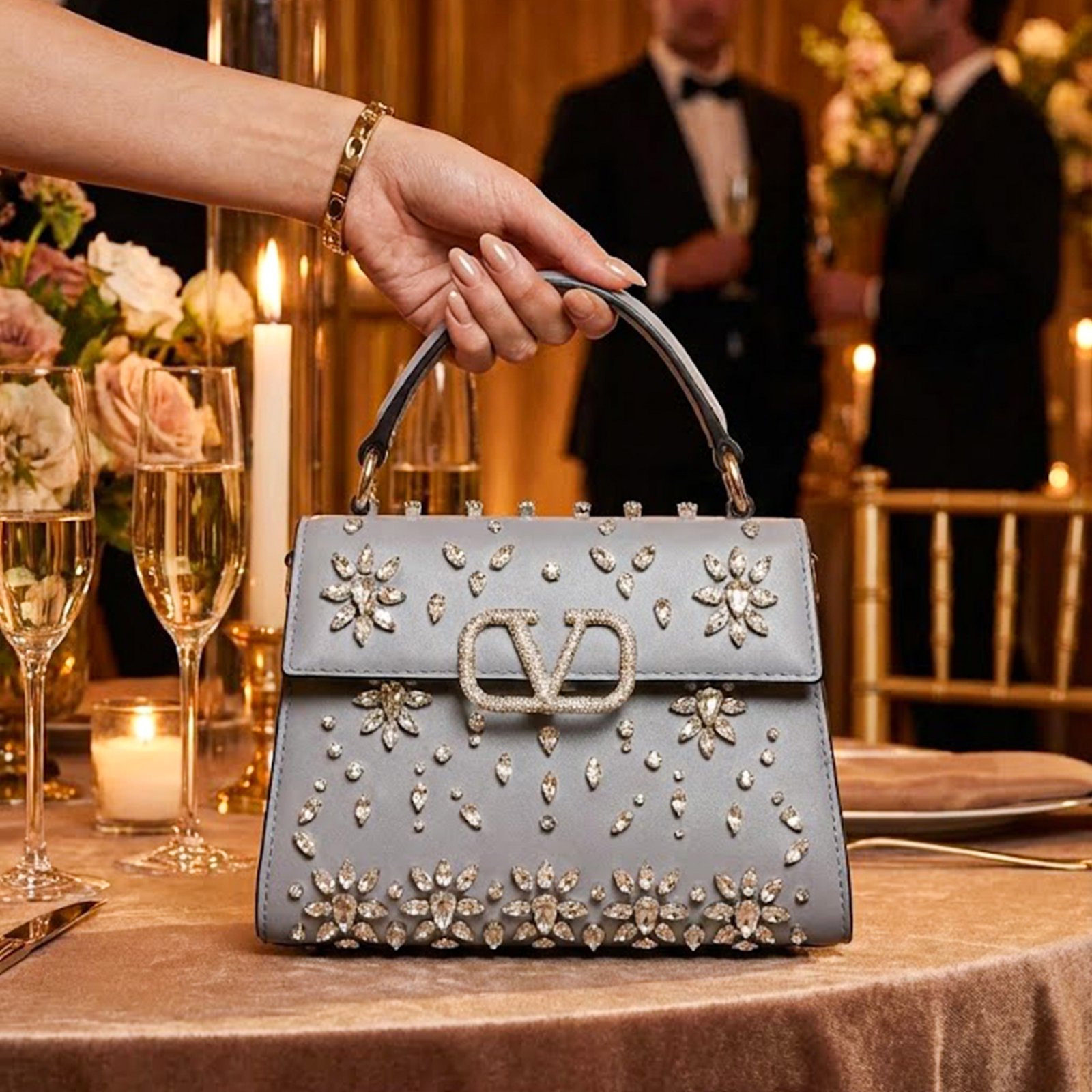 timeless glamour to your collection with the First Copy Valentino Garavani Crystal-Embellished Small VLogo Shoulder Bag in elegant grey leather. Crafted in Italy, this luxurious piece blends refined craftsmanship with modern sophistication, showcasing Valentino’s iconic design aesthetic.