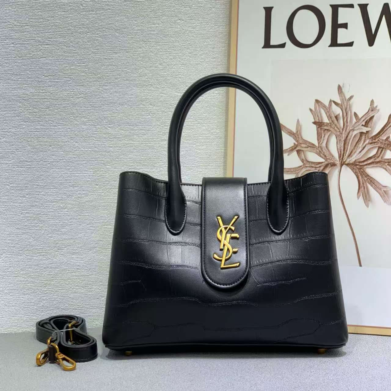 YSL Uptown Croc-Embossed Leather Tote Bag – Black with Gold Hardware